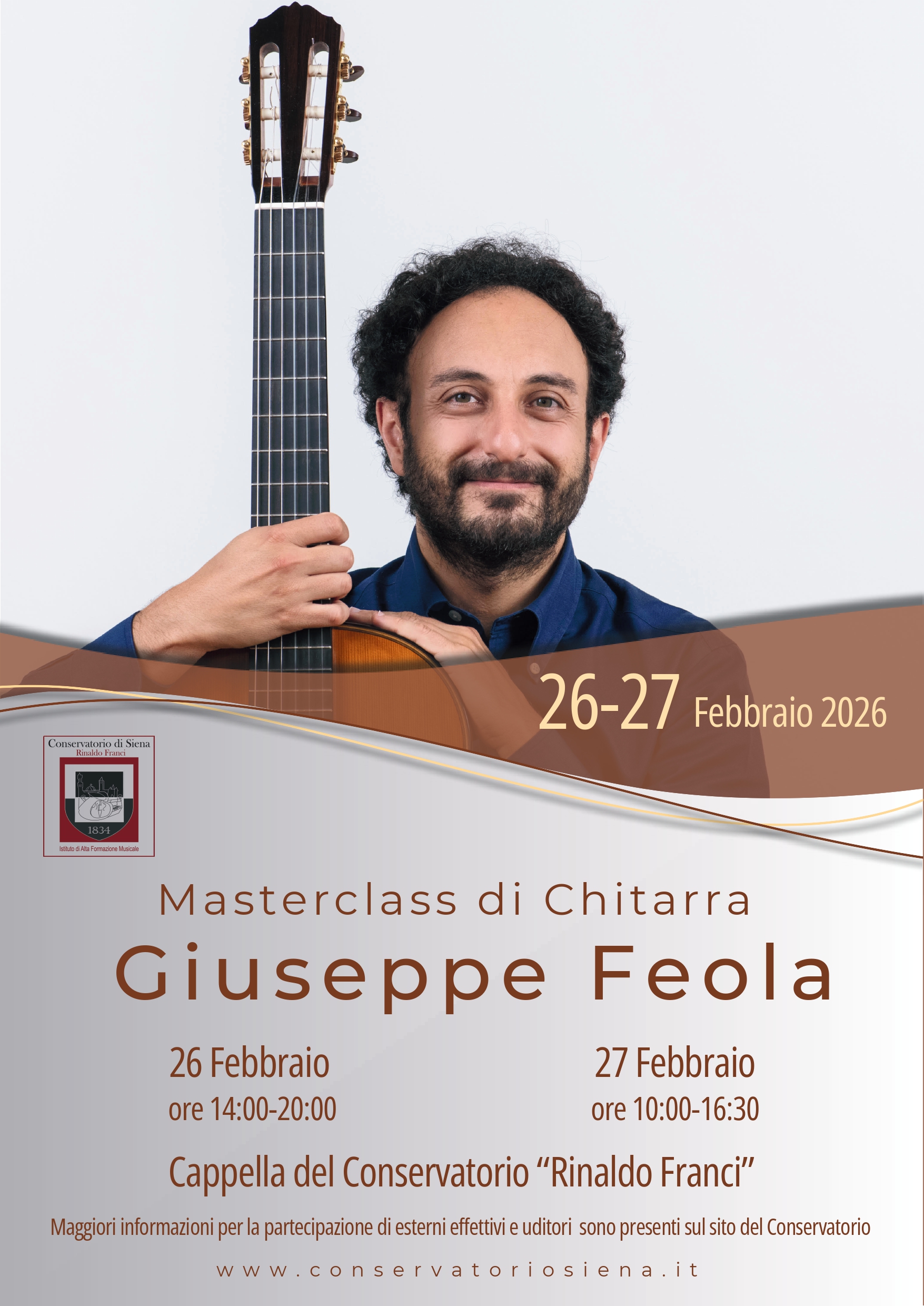 Il Conservatorio di Siena “Rinaldo Franci” è onorato di ospitare una prestigiosa Masterclass di Chitarra tenuta dal M° Giuseppe Feola. L’evento, in programma per il 26 e 27 Febbraio 2026, rappresenta un’occasione imperdibile per chitarristi, studenti e appassionati di perfezionare la propria tecnica e interpretazione sotto la guida di uno dei più raffinati interpreti della chitarra classica a livello internazionale.