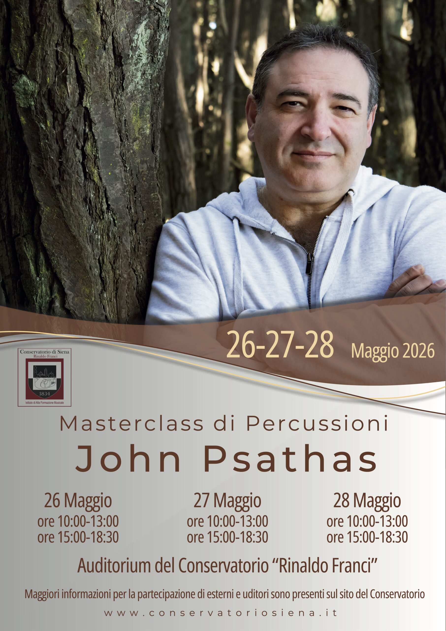 Il Conservatorio di Siena “Rinaldo Franci” è onorato di ospitare una prestigiosa Masterclass di Percussioni tenuta dal M° John Psathas. L’evento, in programma per Maggio 2026, rappresenta un’occasione imperdibile per percussionisti, studenti e appassionati di perfezionare la propria tecnica e interpretazione sotto la guida di uno dei più autorevoli compositori contemporanei a livello internazionale.