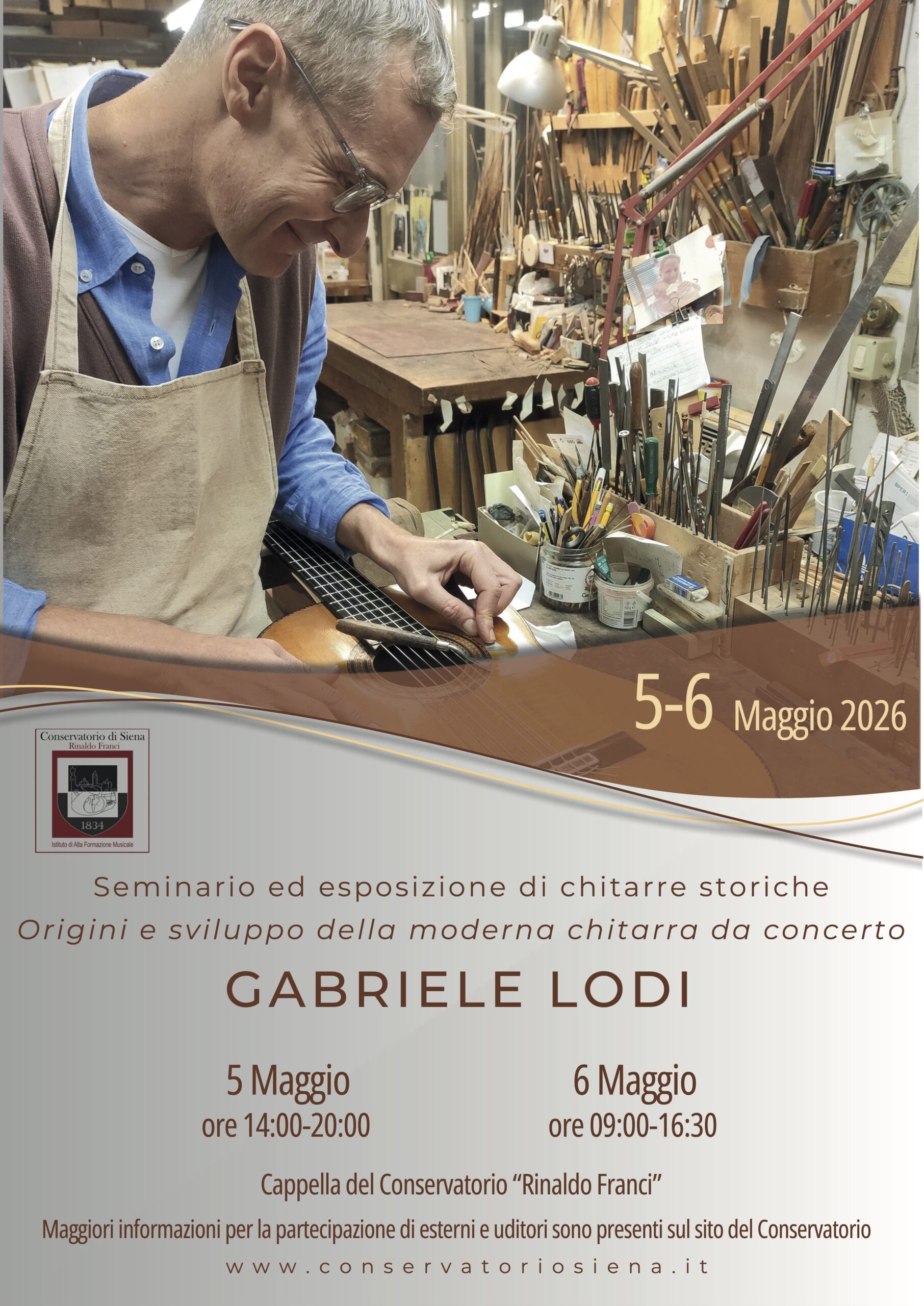 Il Conservatorio di Siena “Rinaldo Franci” è lieto di presentare un evento di due giorni dedicato alla storia, all’evoluzione e alla liuteria della chitarra da concerto. Il seminario, intitolato “Origini e Sviluppo della Moderna Chitarra da Concerto”, sarà tenuto dal Maestro Liutaio Gabriele Lodi e si svolgerà il 21 e 22 Aprile 2026. L’evento include anche una preziosa esposizione di strumenti storici, offrendo un’occasione unica per unire l’arte esecutiva alla conoscenza liutaria.