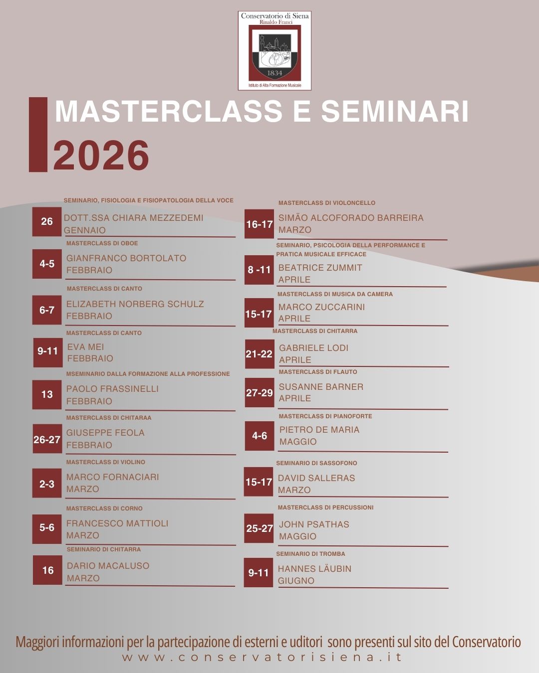Il Conservatorio Rinaldo Franci di Siena, è lieto di presentare il ricco e prestigioso calendario di Masterclass e Seminari per l’anno 2026. Questo programma intensivo è concepito per offrire agli studenti interni, ai musicisti esterni e agli uditori un’opportunità unica di perfezionamento tecnico, interpretativo e professionale, grazie alla presenza di docenti e artisti di fama internazionale.