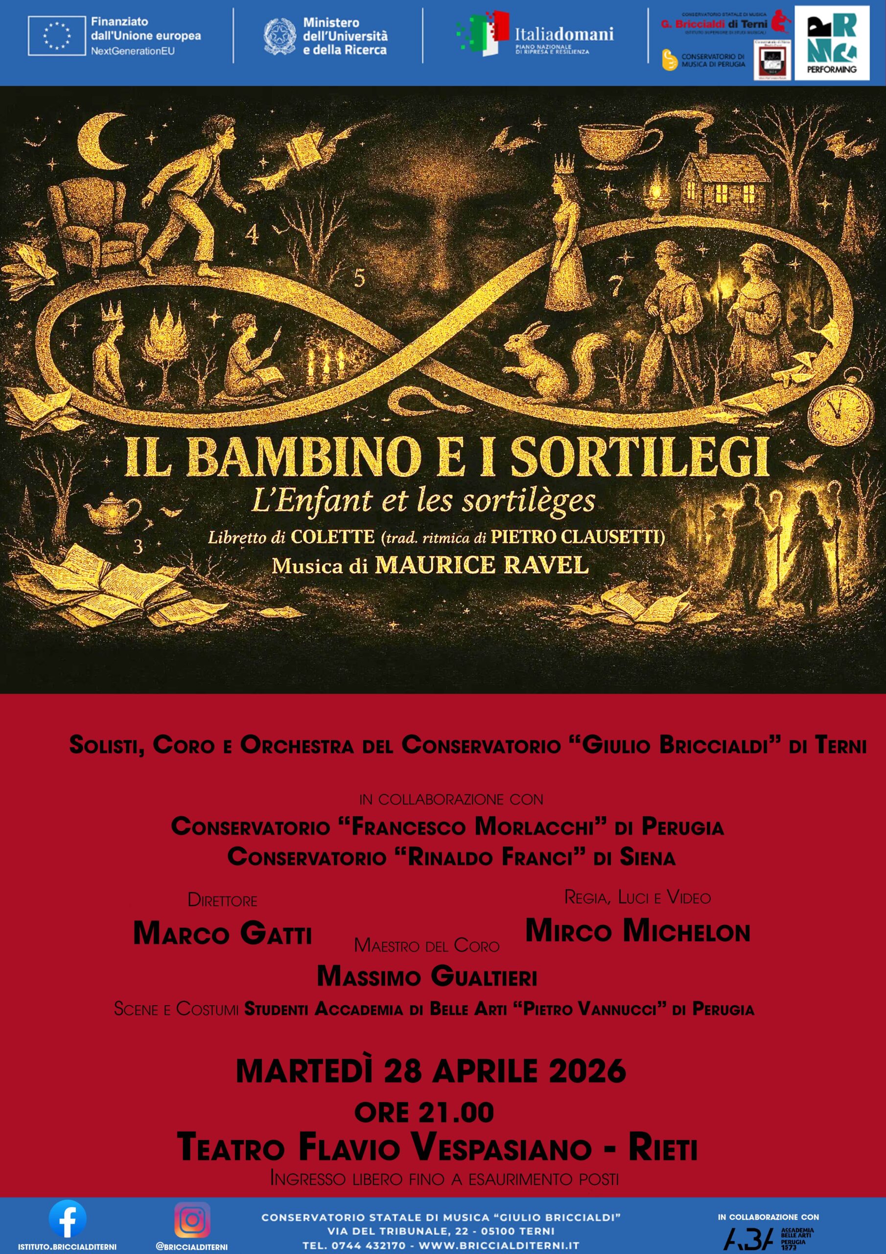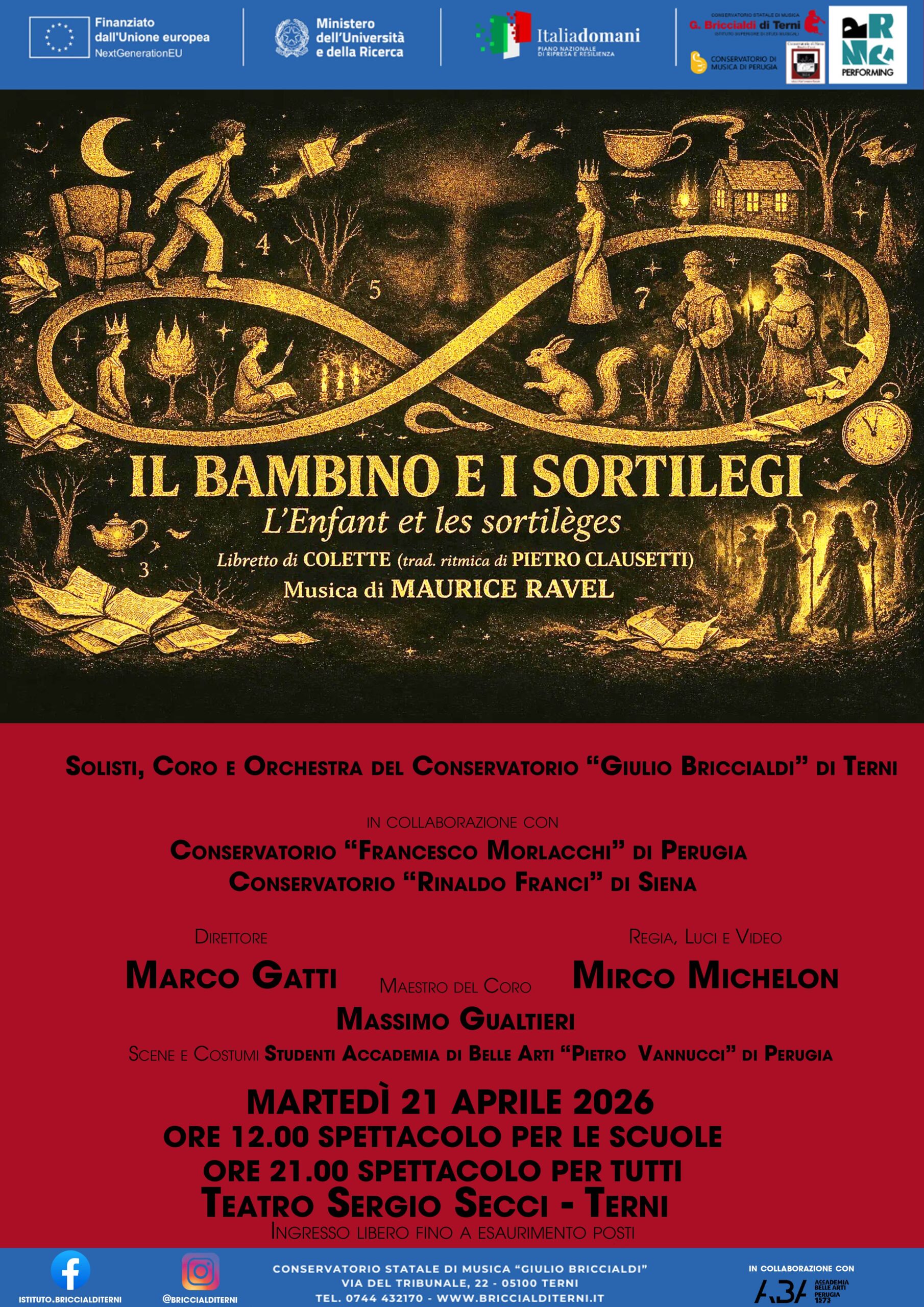 In occasione del progetto “Performing Ravel”, il Conservatorio “Rinaldo Franci” di Siena, in collaborazione con il Conservatorio ” Giulio Briccialdi” di Terni e con il Conservatorio “Francesco Morlacchi” di Perugia, è lieto di annunciare la programmazione delle seguenti due produzioni artistiche de “l’Enfant et les Sortilèges” di Maurice Ravel, con il Conservatorio ” Giulio Briccialdi” di Terni in qualità di capofila: