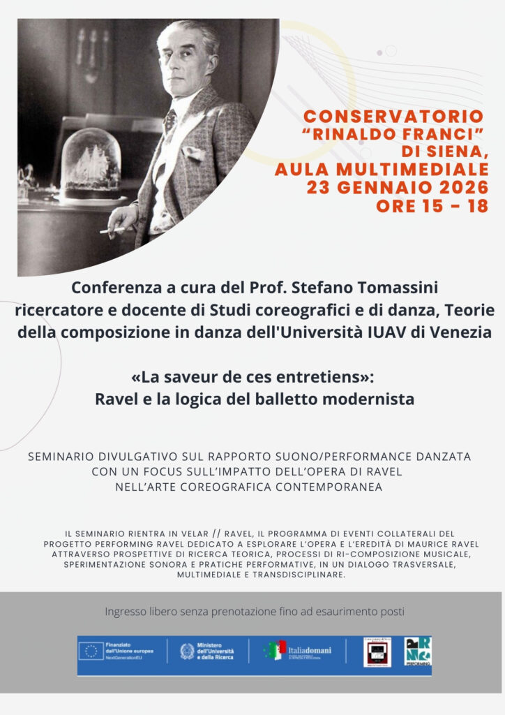 Il seminario divulgativo, sarà a cura del Prof. Stefano Tomassini, ricercatore e docente di  Studi coreografici e di danza, Teorie della composizione in danza dell’Università IUAV di Venezia, e sarà incentrato sul rapporto suono/performance danzata con un focus sull’impatto dell’opera di Ravel nell’arte coreografica contemporanea.